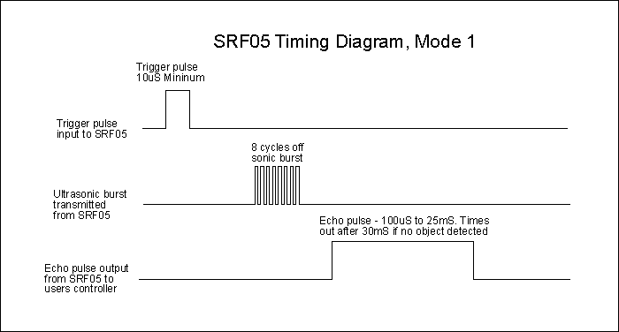 The SRF05 timing diagrams are shown below for each mode. The distance measurement is triggered with a 10µs pulse on the trigger input. The SRF05 will send out an 8 cycle burst of ultrasound at 40kHz and raise its echo line high (or trigger line in mode 2). It then waits for an echo, and lowers the echo line when it detects one. The echo line is therefore a pulse whose width is proportional to the distance to the object. By timing the echo pulse it is possible to calculate the range. If nothing is detected then the SRF05 will lower its echo line anyway after 30ms.