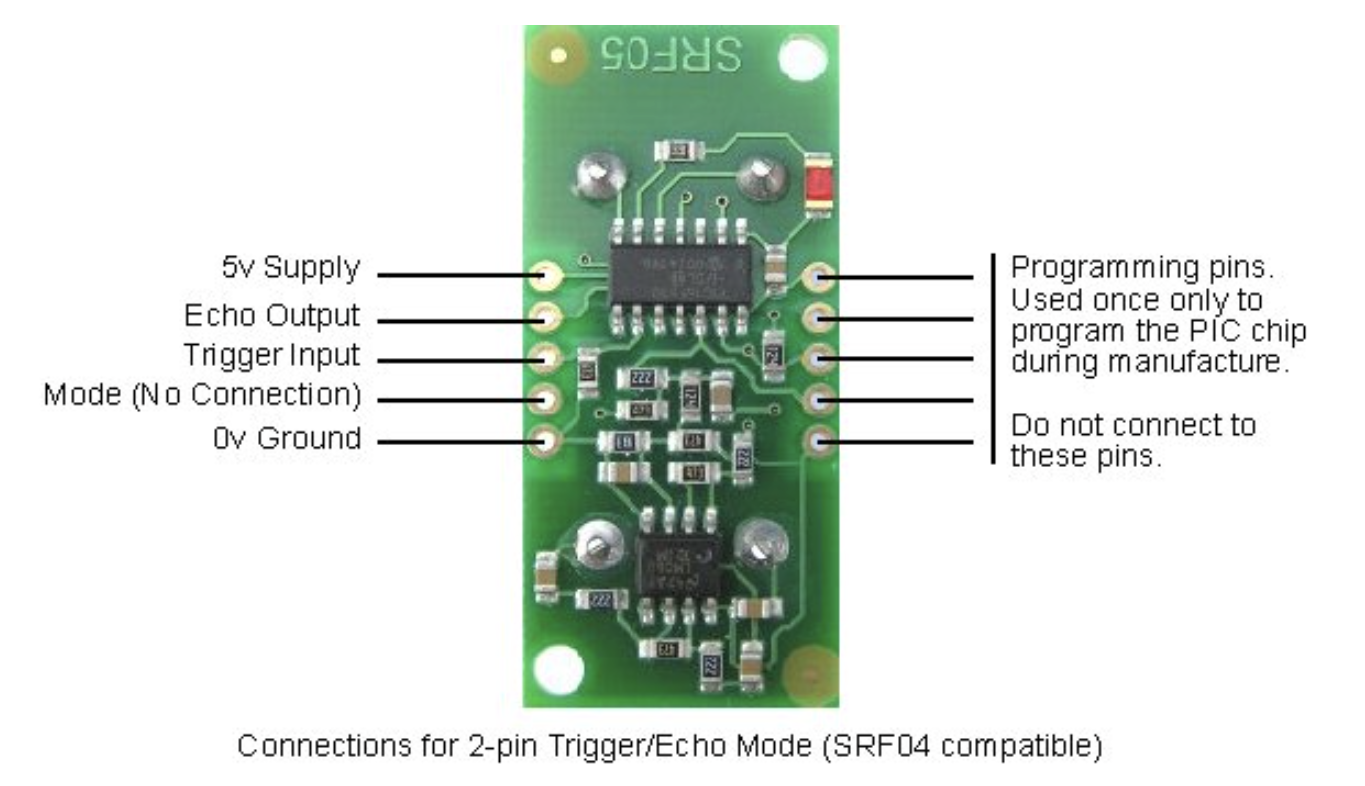 This mode uses separate trigger and echo pins, and is the simplest mode to use. All code examples for the SRF04 will work for the SRF05 in this mode. To use this mode, just leave the mode pin unconnected - the SRF05 has an internal pull up resistor on this pin.