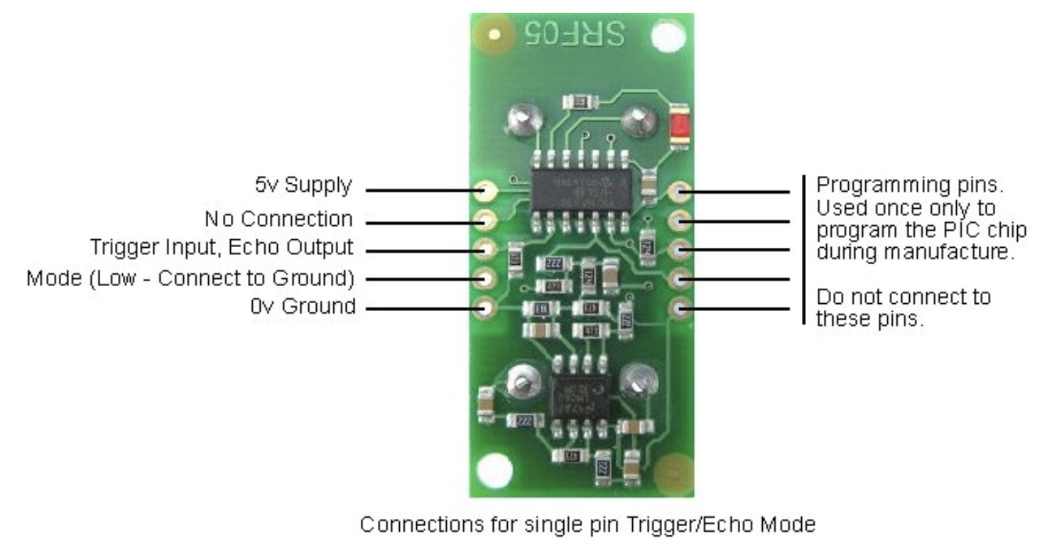 This mode uses a single pin for both Trigger and Echo signals, and is designed to save valuable pins on embedded controllers. To use this mode, connect the mode pin to the 0v Ground pin. The echo signal will appear on the same pin as the trigger signal. The SRF05 will not raise the echo line until 700uS after the end of the trigger signal. You have that long to turn the trigger pin around and make it an input and to have your pulse measuring code ready. The PULSIN command found on many popular controllers does this automatically.