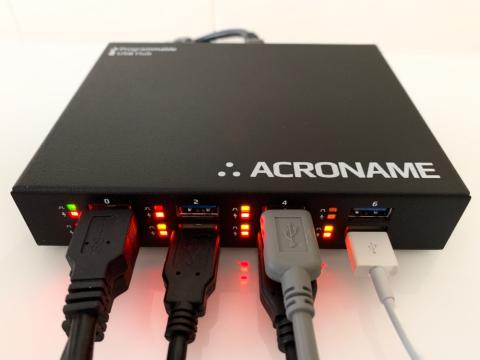 Acroname's hubs are a robust hardware solution to many common usb related tasks: remotely simulating a manual plug-cycle, charging (or not charging) batteries on connected devices, and switching control between two host computers.