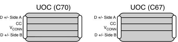 If C70 is used on a port that shorts HS A/B, the second HS pair in the cable acts as an antenna, leading to poor signal quality. Connecting C67 to a port with Muxed HS sides results in no USB 2.0 connection in one of the cable flip orientations.