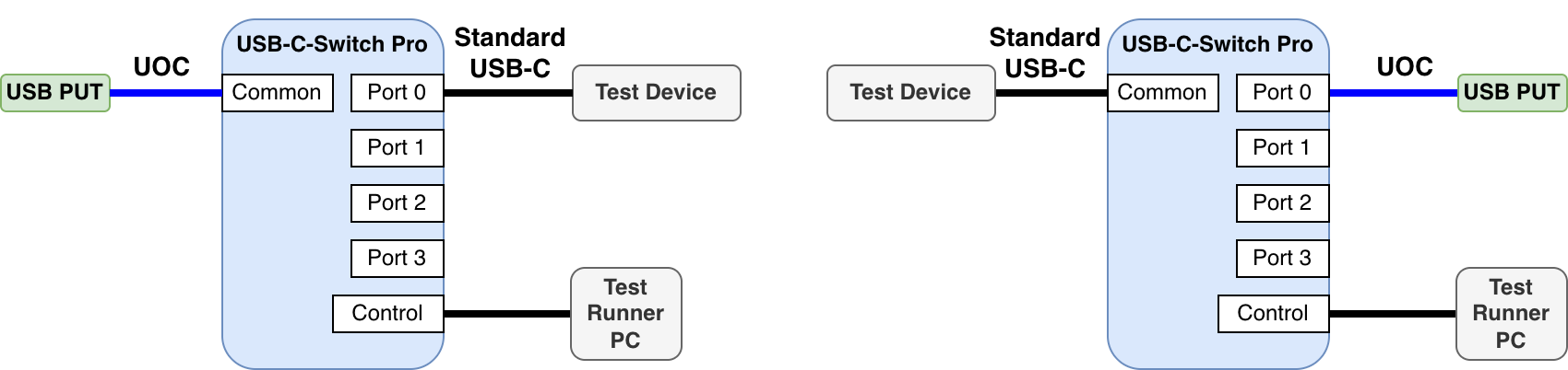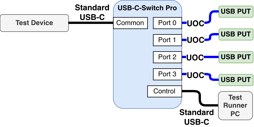 Any attached DUT or testing device may connect to the USB-C-Switch Pro Control Port and act as the test runner.