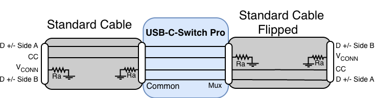 Because the USB-C-Switch Pro joins two cables mid-connection (Common-to-Mux), the orientations of the two cables must match for CC and USB2 to pass through.