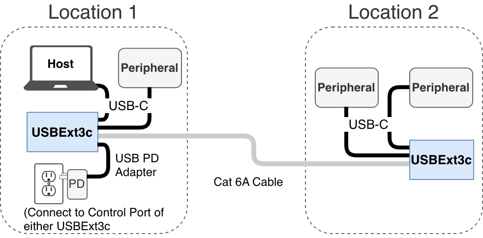 Connect the included 100 W USB-PD power adapter to any available [†] USB port on either USBExt3c. The other extender and attached devices will be powered over the extension link.