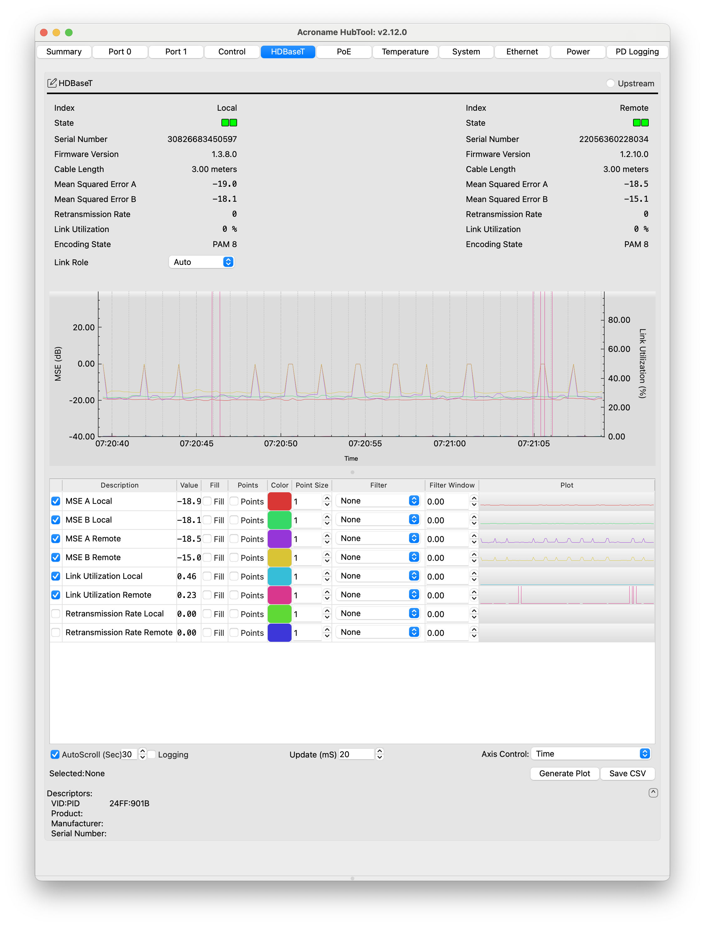 The HDBaseT tab shows the status of the HDBaseT-USB3 connection. The top panel shows data from the local extender on the left and the remote extender on the right.