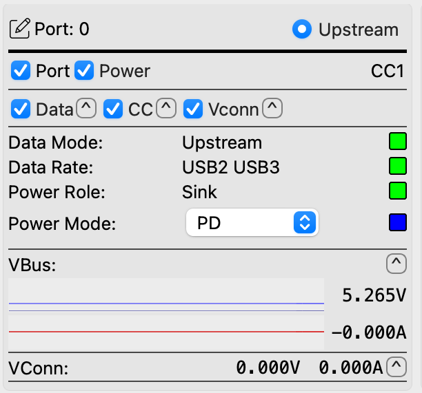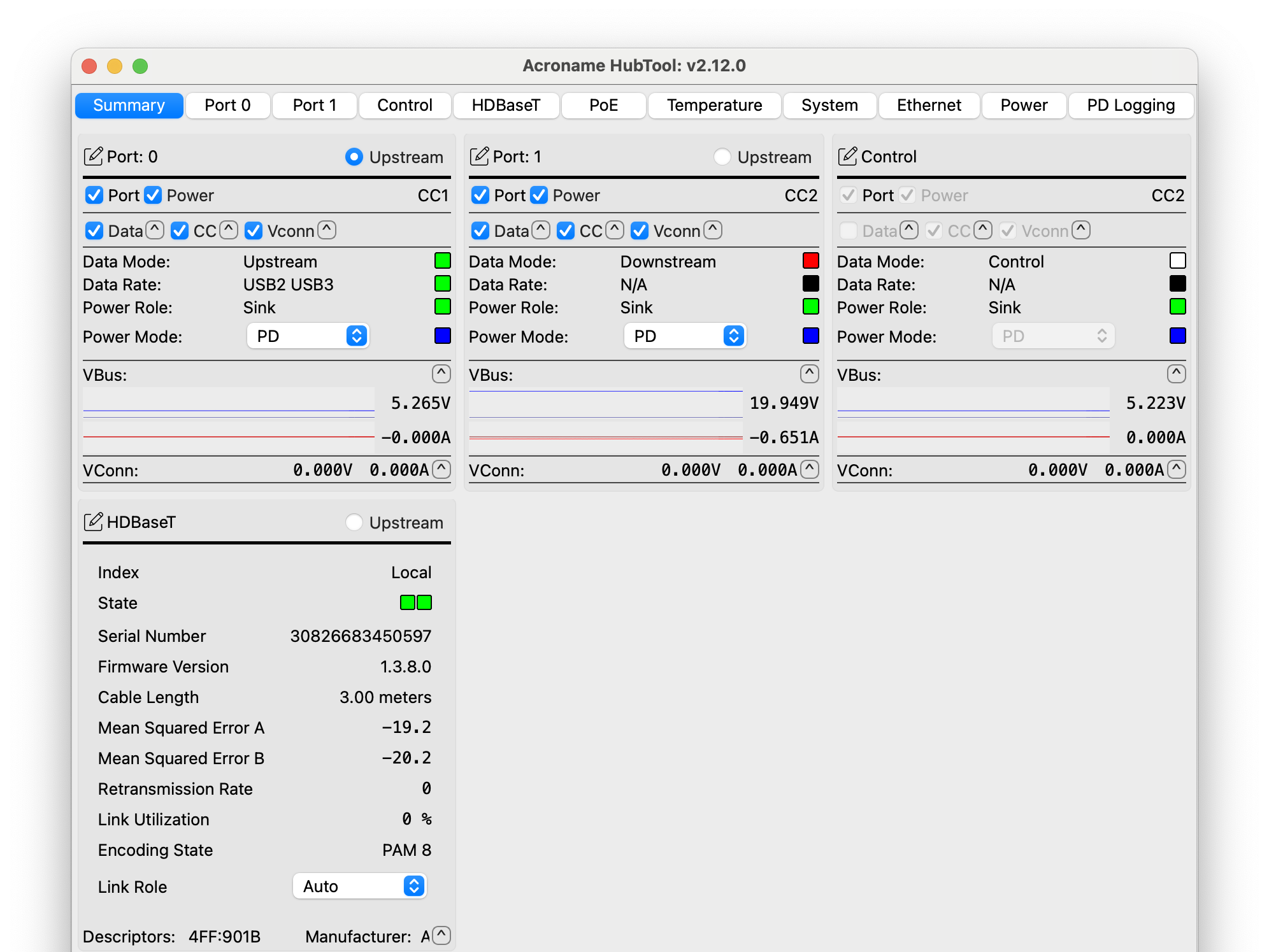 The summary tab displays simplified interface panels for ports 0, 1, Control, and the HDBaseT-USB3 interface.