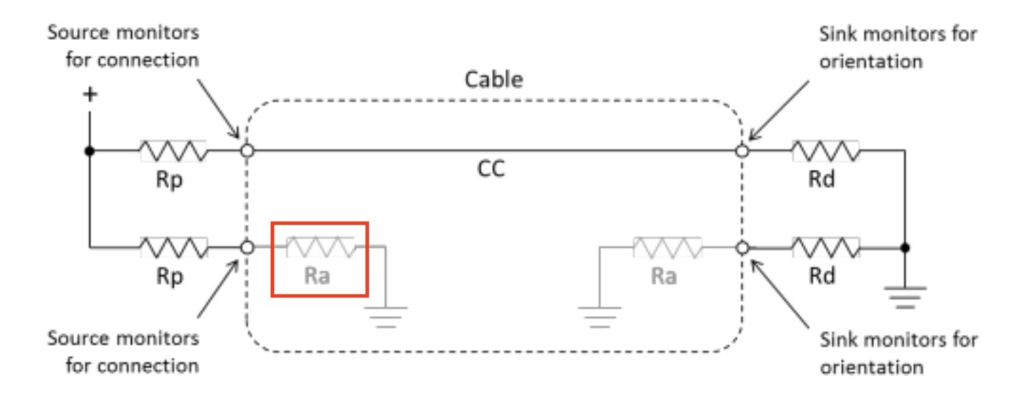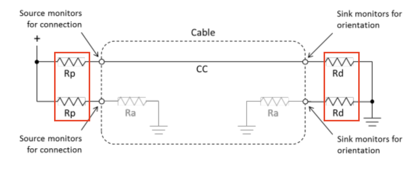 The USB-C connection state machine also uses the CC lines to establish the orientation of the port. For example, the source device uses a pull-up resistor (Rp) on the CC1 line, while the sink device uses a pull-down resistor (Rd) on the CC1 line, and the USB-C cable's CC orientation aligns with CC1 on both ports. They have established a connection and are oriented around CC1.