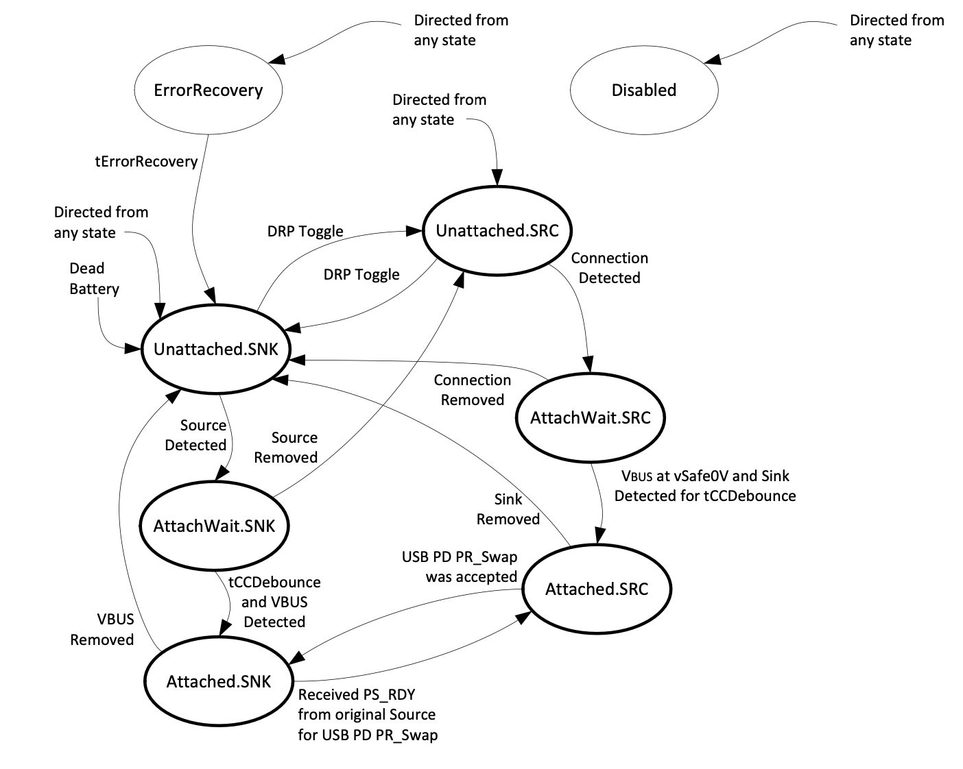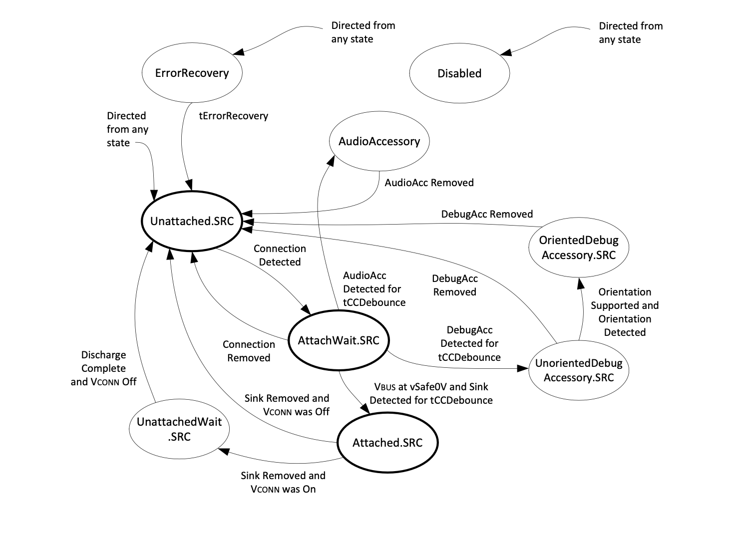 The ability for a USB-C connector to be either power role is unique from the previous generation. USB-A ports are fixed as a power source, while USB-B ports remain a power sink. Also, because of the USB-C port's ability to be either power role, they have the option to remain disabled until there's an established connection and a known power role. The ability to detect a connection, be either power role, and have multiple connector orientations created the need for a connection state machine.