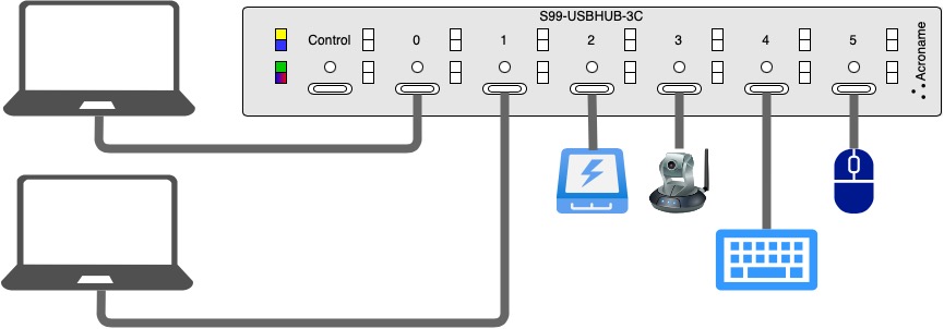 With Acroname’s auto host-switching technology, when a user’s host Laptop is plugged in to the USBHub3c, all USB peripherals connected to USBHub3c will then automatically switch from the room computer to that user’s machine.