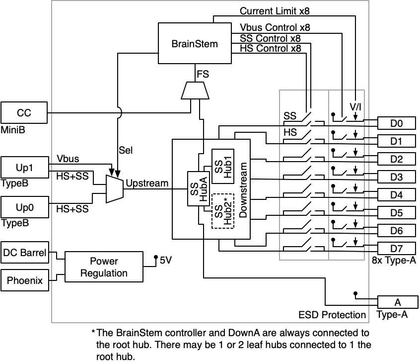 - Hi-Speed data, SuperSpeed data and power lines can be separately enabled for each downstream port